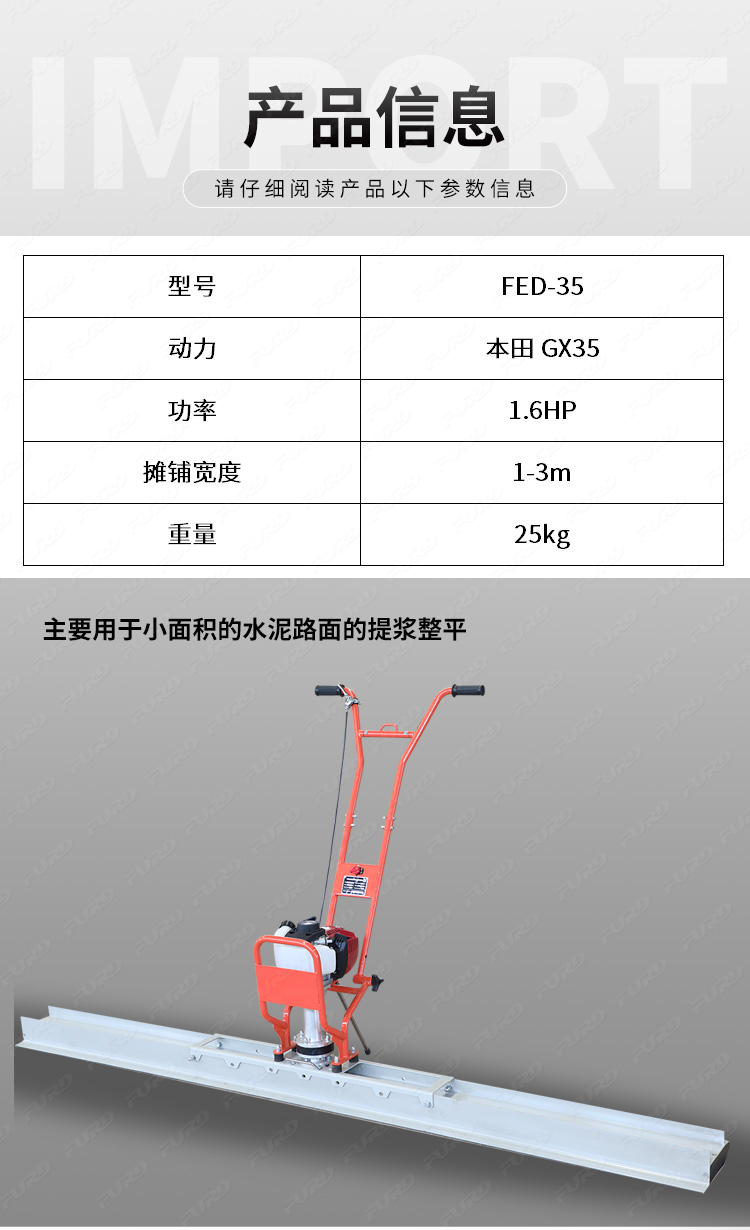 主要用于小面積的水泥路面地面的提漿整平。