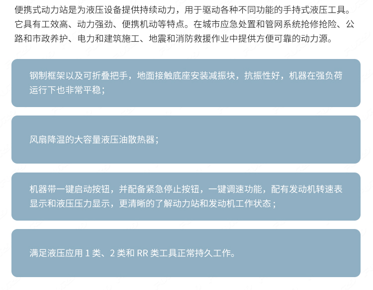 適用于路面搶修、道路施工、市政維護、保養(yǎng)、園林等工作場景 ;.設備安裝便捷,搬運簡便,適應性強,可輕松解決破碎、切削、分裂、打樁、壓實等施工項目。